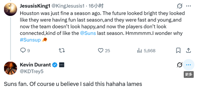 杜兰特也回复这位球迷:“太阳队的球迷啊。难怪你会信这种话是我说的,哈哈,真没劲!”